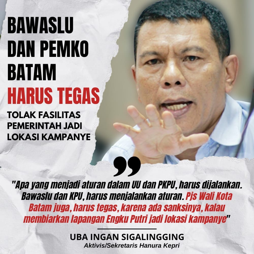 “Apa yang menjadi aturan dalam UU dan PKPU, harus dijalankan. Bawaslu dan KPU, harus menjalankan aturan. Pjs Wali Kota Batam juga, harus tegas, karena ada sanksinya, kalau membiarkan lapangan Engku Putri jadi lokasi kampanye” kata Uba mengingatkan.
