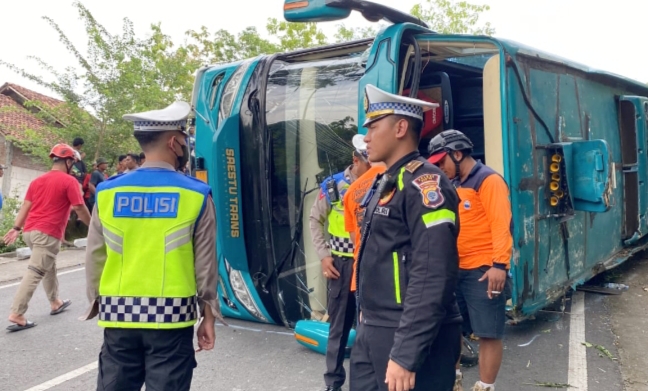 Informasi sementara kecelakaan tunggal menimpa bus pariwisata Saestu Trans terjadi pada pukul 13. 41 WIB.