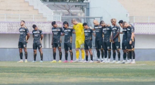 Para pemain Dewa United FC melakukan minute of silence atau mengheningkan cipta untuk mengenang para korban Tragedi Kanjuruhan. (Media Dewa United FC )