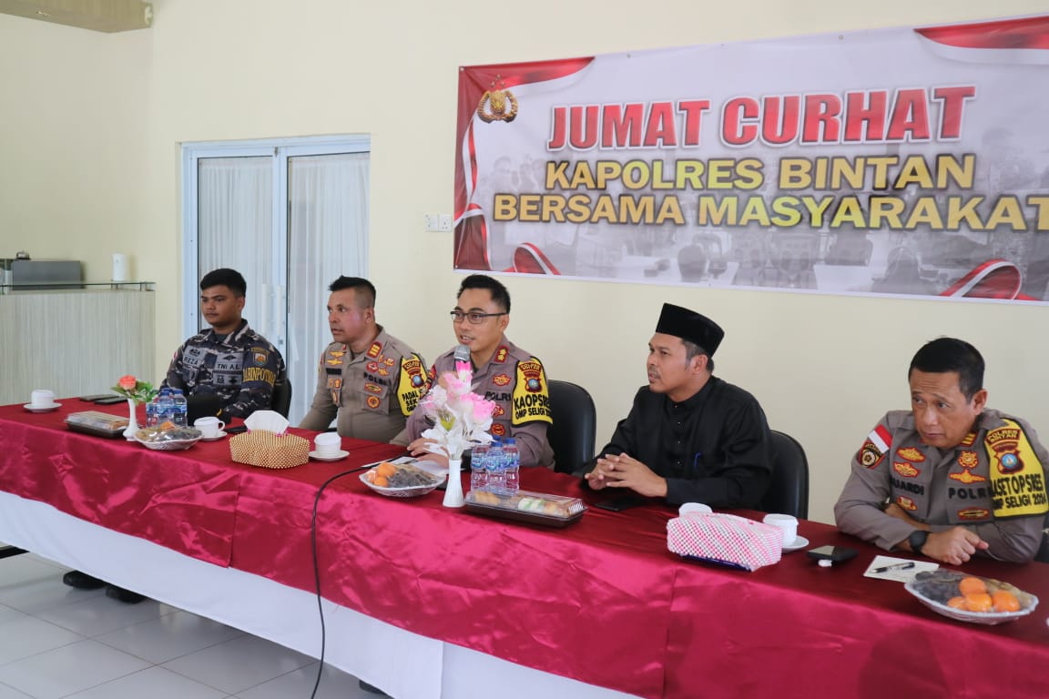 BINTAN, GURINDAM. TV — Kapolres Bintan AKBP Riky Iswoyo, S.I.K., M.M kembali melaksanakan Jumat Curhat untuk menampung aspirasi dan mendengarkan keluhan masyarakat secara langsung, selain untuk menampung keluhan masyarakat juga sebagai forum diskusi antara Polri dan masyarakat untuk memecahkan masalah yang dialami masyarakat, Jumat Curhat tersebut dilaksanakan di Aula SMKN 1, Jumat (6/9/2024).