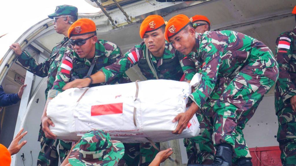 Seluruh Personel membantu untuk menurunkan bantuan yang ada di pesawat untuk selanjutnya bantuan akan dibawa menuju KRI Bontang 907 yang bersandar di faslabuh selat lampa yang disiapkan untuk membawa bantuan tersebut menuju daerah terdampak tanah longsor di Serasan.