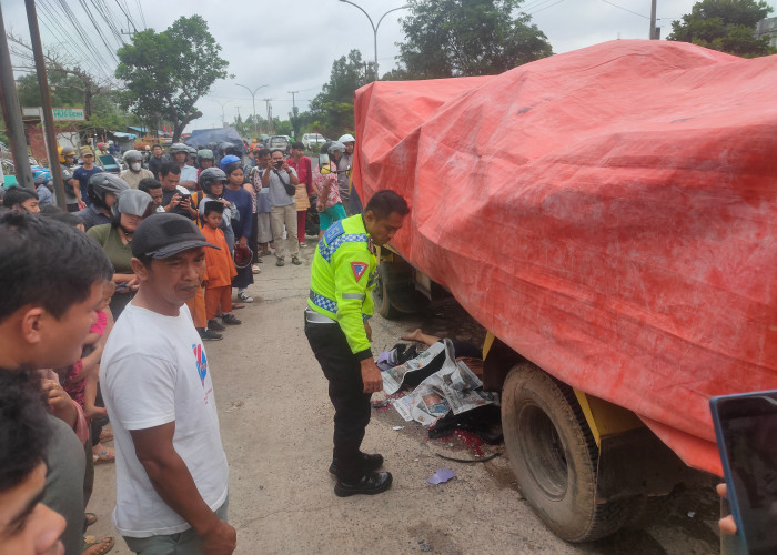 Korban ibu rumah tangga (IRT) yang belum diketahui identitasnya tersebut terbujur kaku setelah dilindas truk berNopol BP 9023 UT.