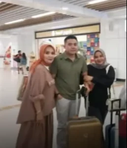 Sementara di tangan kanannya menggenggam botol air minum kemasan. Tepat di sebelahnya sendiri, kala itu duduk seorang wanita berhijab dengan balutan atasan berwarna putih dipadu vest bercorak motif garis cokelat dan celana jeans.