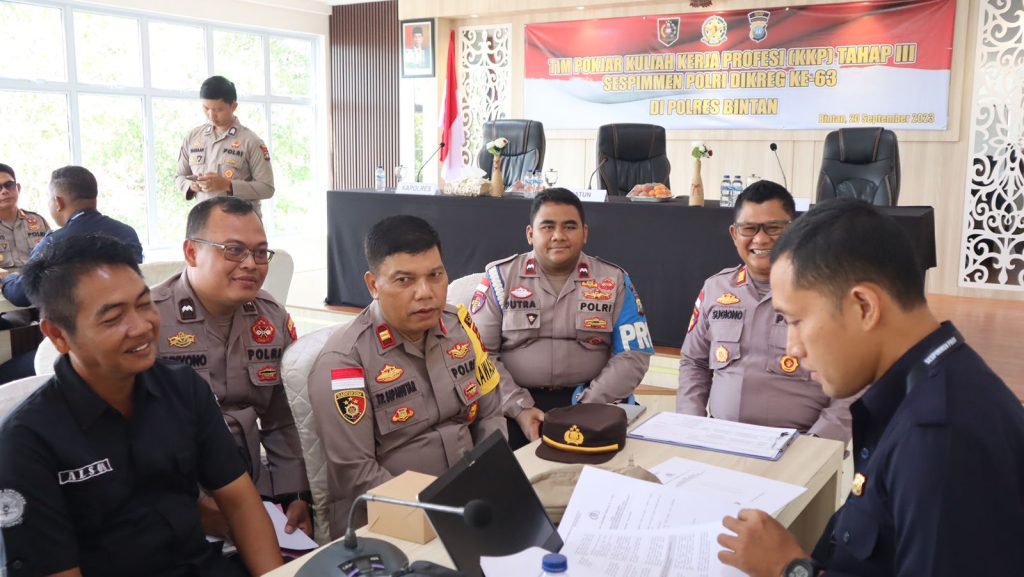 BINTAN,GURINDAM.TV -– Sebanyak 11 Siswa Sekolah Staf dan Kepemimpinan Menengah (Sespimmen) Polri melaksanakan Kuliah Kerja Profesi (KKP) Dikreg Ke-63 Tahun 2023 diwilayah Polres Bintan, Kedatangan siswa Sespimmen tersebut dipimpin oleh Kombes Pol Marjuki, S.,I.,K., M.Si. selaku Patun 1/Kabid Pengsos Sespim dan Kombes Pol Adi Sumirat, S.,I.,K., M.H., M.M., CPHR selaku Patun 2/WI Muda Sespimmen
