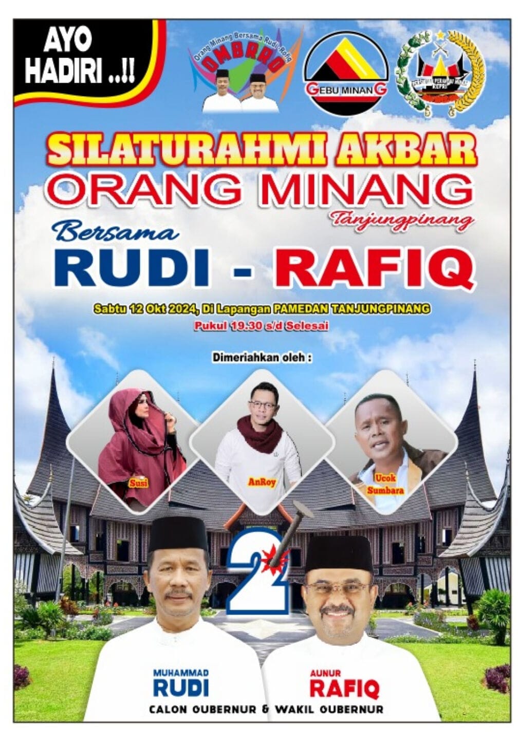 TANJUNGPINANG, GURINDAM.TV– Kabar gembira! Pelaku usaha mikro, kecil, dan menengah (UMKM) di Kota Tanjungpinang, akan mendapatkan tempat jualan gratis pada acara Silaturahmi Akbar Orang Minang Bersama Haji Muhammad Rudi – H Aunur Rafiq (Rudi-Rafiq), Sabtu (12/10/2024), mulai pukul 19.30 malam.
