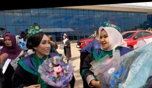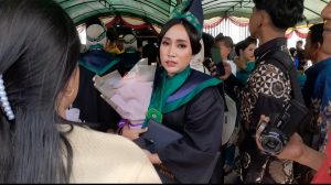 Anisa terlihat bahagia dan penuh semangat saat keluar dari ruang wisuda. Wajahnya berseri-seri sambil membawa buket bunga di tengah keramaian para wisudawan lainnya.